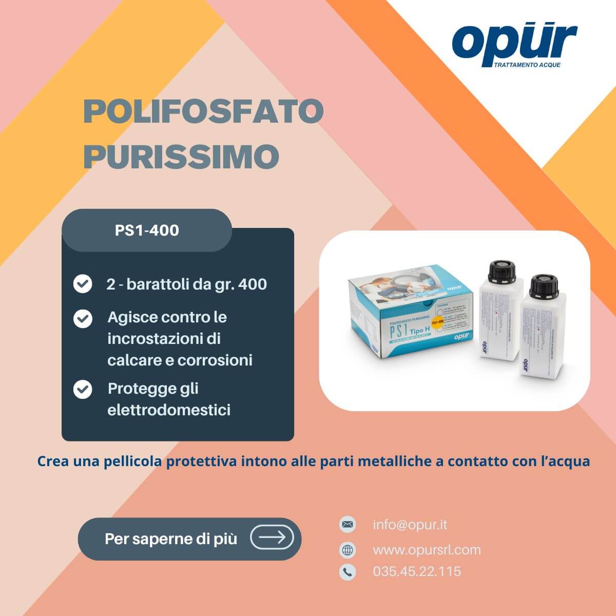 🟣 Il polifosfato in polvere è una soluzione efficace per il trattamento anticalcare nei dosatori proporzionali 🟣 Protegge caldaie, tubature ed elettrodomestici formando un film protettivo contro incrostazioni e corrosione 🟣 È facilmente solubile, sicuro per l’uso con acqua potabile e conforme alle normative europee 🟣 Ideale per impianti domestici e professionali, garantisce una protezione continua e duratura 🟣 La ricarica in polvere consente una preparazione semplice e un dosaggio preciso nel tempo
